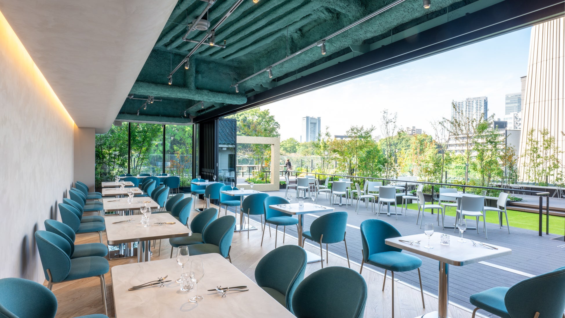 全面ガラス張りの解放感溢れる店内、屋上庭園に隣接するテラス席も併設され、武道館や靖国神社の鳥居、お堀などを眺め、四季折々の景色の移ろいに癒されます。